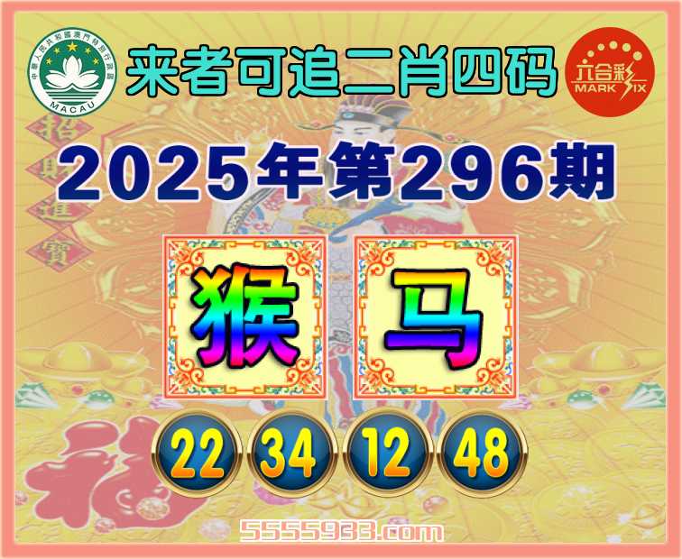 296期:【来者可追】 二肖四码【猴马】【22.34.12.48】开:猴22准